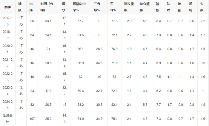 上赛季许晨妍场均26.7分钟,拿到15分7.7篮板1.7助攻0.9抢断0.8盖帽,命中率53.2%入选全明星阵容。
